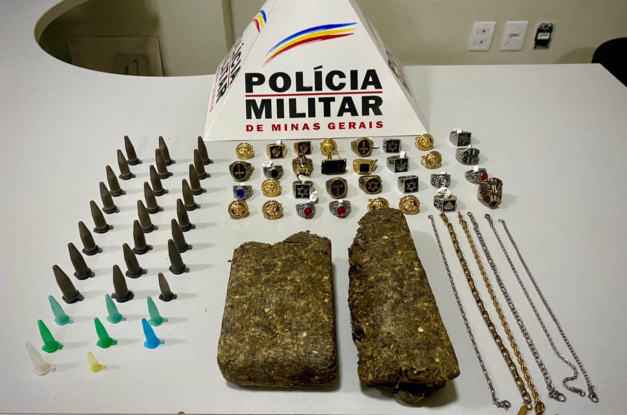 De acordo com a PM, os militares continuaram com a operação, que resultou na apreensão de duas barras de maconha, de aproximadamente um quilo, 17 pinos de cocaína, 15 pinos vazios, 06 cordões e 32 anéis de modelos variados.