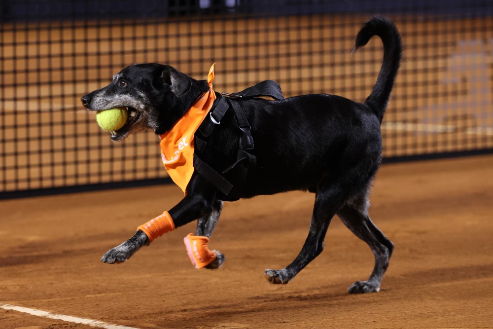 Os seis cães divertiram o público e mostraram habilidade para pegar as bolinhas durante o bate bola dos tenistas, após a vitória de Monteiro contra o argentino Sebastian Baez. Os cachorros estão sob os cuidados da ONG Patinhas Anônimas e aguardam a chance de um lar.