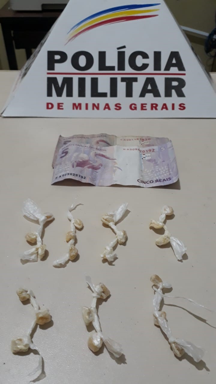 Os policiais foram até o local, realizaram a abordagem do indivíduo e, durante buscas, os policiais localizaram 21 pedras de crack e R$ 10 em espécie.