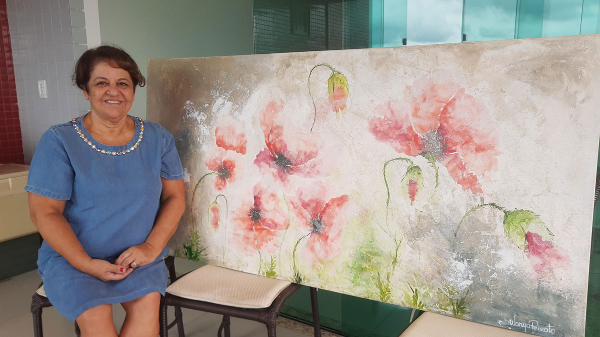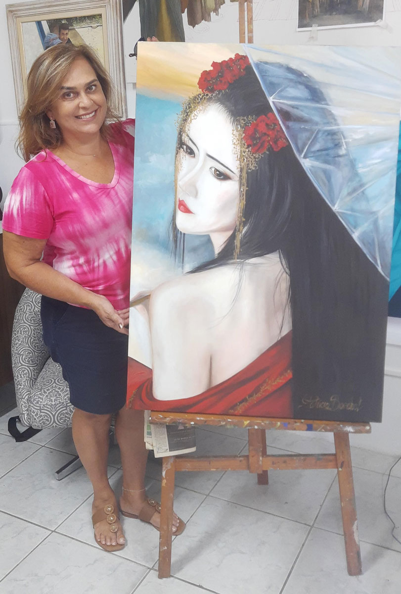 Gueixa e Pétalas, em óleo sobre tela, da artista Patrícia Boechat, figura entre os trabalhos em exibição. “A arte faz parte da minha vida, desde a hora que eu acordo até à noite. A arte faz parte da vida de todos nós, basta que percebamos”, sublinha Patrícia.