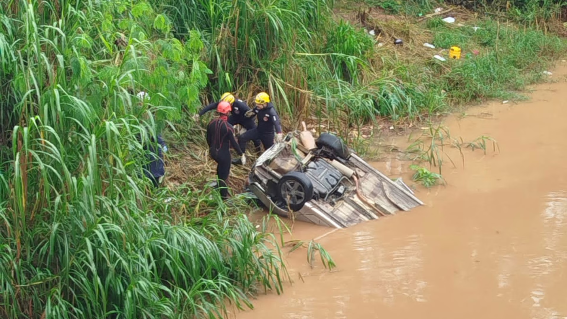 Três bombeiros, equipados com roupas de mergulho, entraram no ribeirão para acessar o carro, enquanto outros três atuaram na montagem de rotas de rapel para estabilizar a descida dos materiais usados na operação de salvamento.