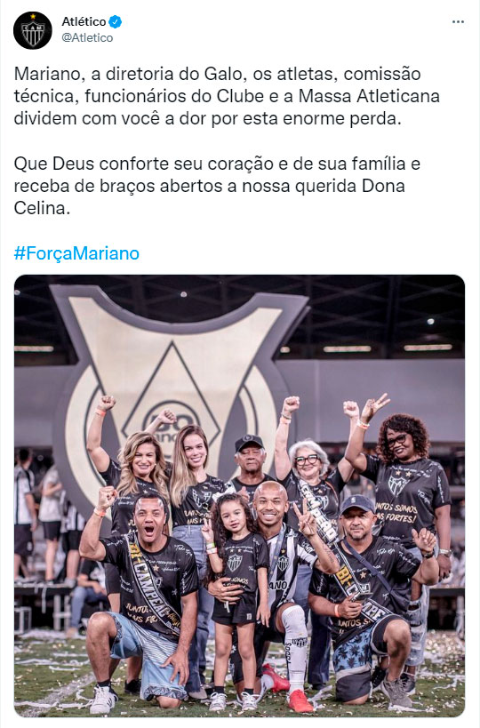 Em seu perfil no Twitter, o Atlético-MG se pronunciou e lamentou a morte de Dona Celina. “Mariano, a diretoria do Galo, os atletas, comissão técnica, funcionários do Clube e a Massa Atleticana dividem com você a dor por esta enorme perda. Que Deus conforte seu coração e de sua família e receba de braços abertos a nossa querida Dona Celina”.