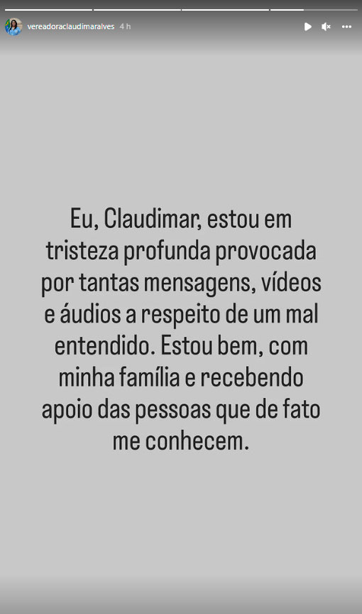 Na manhã deste sábado (23), a vereadora usou seu perfil no Instagram para falar que a situação não passou de um mal entendido. “Eu, Claudimar, estou em tristeza profunda provocada por tantas mensagens, vídeos e áudios a respeito de um mal entendido. Estou bem, com minha família e recebendo apoio das pessoas que de fato me conhecem”.