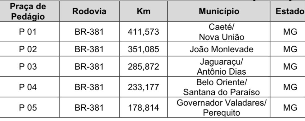 Estão previstas 5 praças de pedágio distribuídas da seguinte forma: