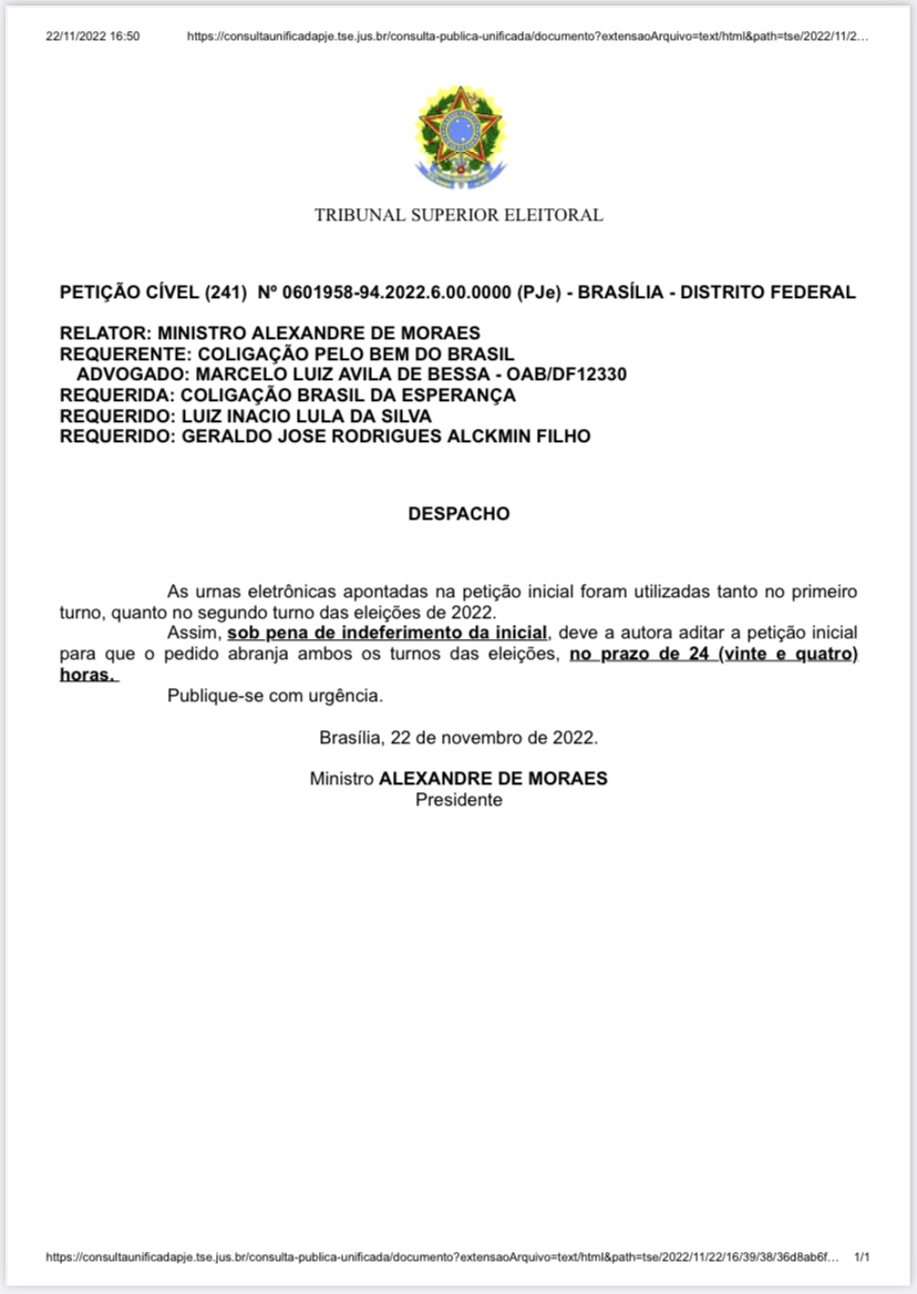 “As urnas eletrônicas apontadas na petição inicial foram utilizadas tanto no primeiro turno, quanto no segundo turno das eleições de 2022. Assim, sob pena de indeferimento da inicial, deve a autora aditar a petição inicial para que o pedido abranja ambos os turnos das eleições, no prazo de 24 (vinte e quatro) horas. Publique-se com urgência”, diz o texto.