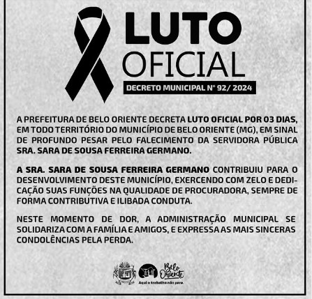 “Sara de Sousa Ferreira Germano vinha contribuindo imensamente para o desenvolvimento deste Município, exercendo com zelo e dedicação suas funções na qualidade de Procuradora, sempre de forma contributiva e ilibada conduta”, pontua o documento assinado nesta segunda-feira. Enquanto perdurar o luto referido no artigo anterior, as bandeiras do Município de Belo Oriente ficarão hasteadas até meio mastro”.