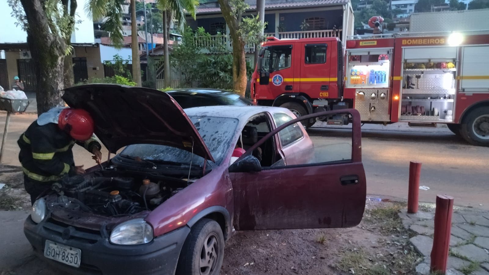 Segundo os bombeiros, eles foram acionados e, chegando ao local, foi constatado que o incêndio estava ocorrendo em um veículo que se encontrava estacionado na calçada. Diante disso, os militares utilizaram um mangotinho para o combate das chamas no interior do veículo.