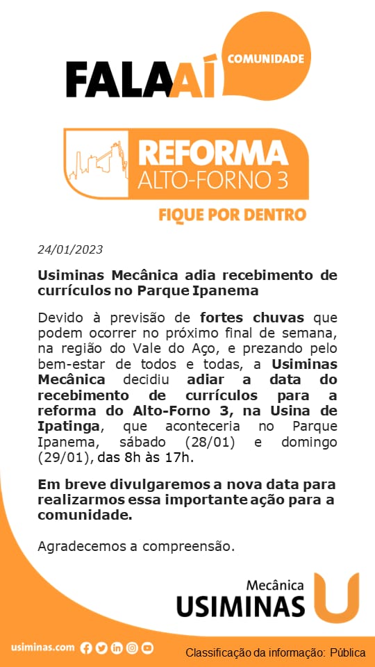 Nesta terça-feira (24), a Usiminas Mecânica anunciou o adiamento da entrega de currículos, no Parque Ipanema, em Ipatinga, Minas Gerais, prevista para o próximo fim de semana (28 e 29 de janeiro). O cancelamento é devido a previsão do tempo, que aponta possibilidade de fortes chuvas.