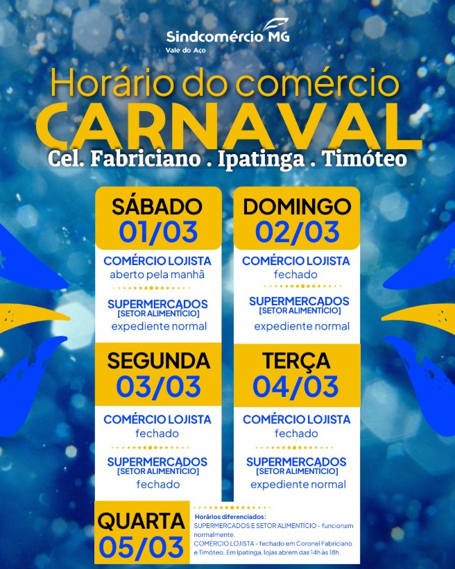 No dia 1º de março (sábado), todo o comércio do Vale do Aço estará aberto. Lojas de rua funcionarão apenas no período da manhã, enquanto supermercados e estabelecimentos do setor alimentício operarão normalmente ao longo do dia. Já no domingo, as lojas de rua estarão fechadas, mas supermercados e demais comércios do setor alimentício manterão expediente normal.