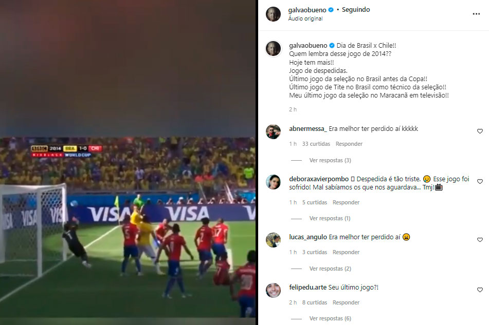 Em seu perfil oficial no Instagram, Galvão Bueno anunciou que esse será seu último jogo narrando a seleção no Maracanã, um dos estádios mais conhecidos de todo o mundo. O assunto virou um dos mais comentados no Twitter.