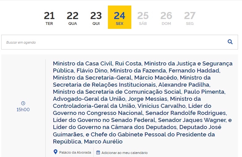 O presidente Luiz Inácio Lula da Silva (PT) está reunido com 8 ministros e os líderes do governo no Palácio do Alvorada nesta sexta-feira (24), mesmo depois de ser diagnosticado com pneumonia leve. Chegou haver o anúncio que a reunião que estava marcada para a parte da manhã no Palácio do Planalto seria adiada. Mas houve a alteração do horário e do local: Palácio do Alvorada. Outra mudança na agenda de Lula por conta da infecção foi a data do embarque para a China.