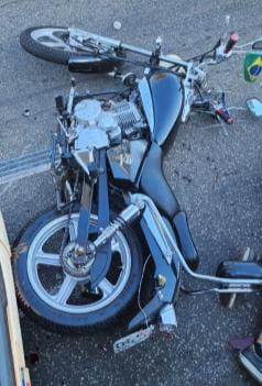 A carreta, formada por um caminhão-trator e um reboque, estava na faixa central da rodovia. À sua frente, caída ao solo, estava a motocicleta de cor preta, com o motociclista ao lado, ferido. Ambos os veículos envolvidos no acidente estavam devidamente licenciados e seus condutores possuíam habilitação legal compatível.