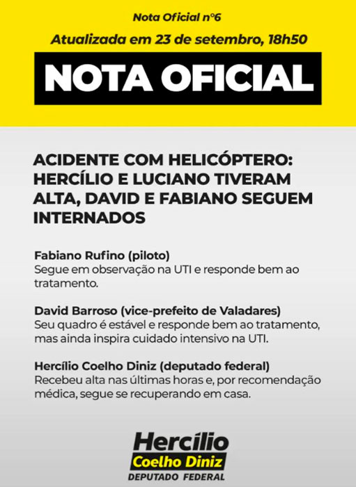 Já Fabiano Rufino segue em observação, também na UTI, e responde bem ao tratamento. Hercílio Diniz recebeu alta e, por recomendação médica, segue se recuperando em casa. Luciano Viana recebeu atendimento médico após o acidente e teve alta no mesmo dia.