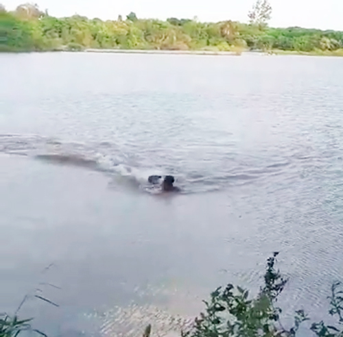 Um vídeo, que circula em grupos de WhatsApp, mostra o momento em que o homem, sem identificação, está nadando e é atacado por um jacaré. Ele consegue se desvencilhar do animal e sair do lago. Veja:
