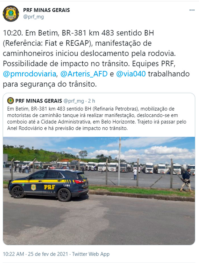 Segundo a Polícia Rodoviária Federal, na BR-381 km 483, no sentido BH/Refinaria Petrobras, ocorre uma mobilização de motoristas de caminhão tanque. Eles devem iniciar um deslocamento em direção a Cidade Administrativa, sede do Governo de Minas Gerais.