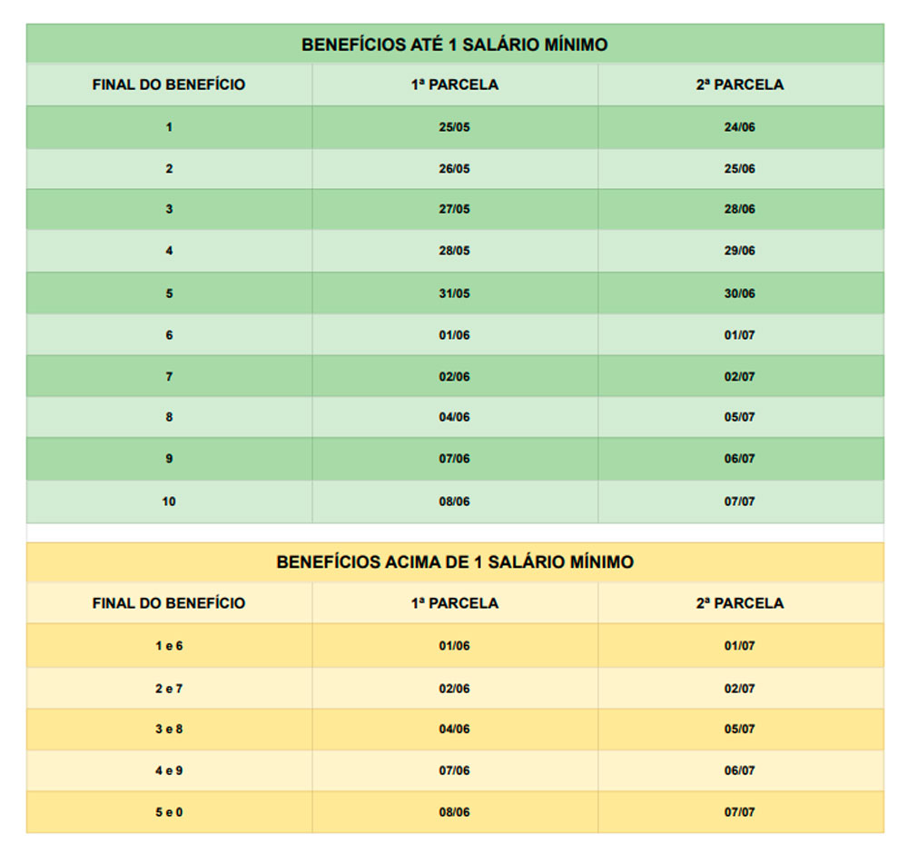 Essas datas valem para quem recebe aposentadorias, auxílios e pensões de até um salário mínimo. Para quem ganha acima do mínimo, o calendário é um pouco diferente. A primeira parcela será paga de 1º a 8 de junho; e a segunda, de 1º a 7 de julho. Começam a receber os segurados de final 1 e 6, passando para 2 e 7 no dia seguinte e terminando nos finais 9 e 0.