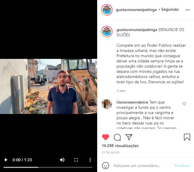 “Pessoal, nós estamos aqui na rua Varginha, no bairro Centro e já a quarta vez em menos de um mês que a equipe da prefeitura aqui nesse mesmo local para fazer a limpeza da sujeira que os sujões fazem nesse mesmo local”, afirmou no vídeo que foi publicado no mesmo dia.