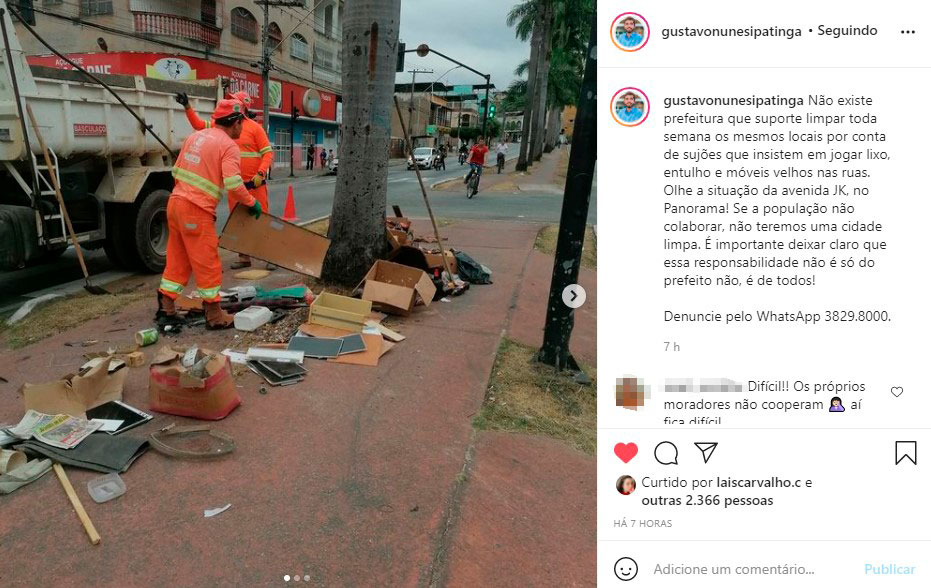 Através do Instagram, o chefe do executivo comentou sobre a dificuldade de limpar toda semana os mesmos locais.“Não existe prefeitura que suporte limpar toda semana os mesmos locais por conta de sujões que insistem em jogar lixo, entulho e móveis velhos nas ruas”, escreveu.