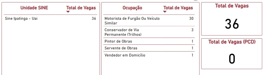 Em Ipatinga, há 36 postos de trabalho disponíveis. A maior parte, 30 vagas, é voltada para motorista de furgão ou veículo similar. Há três vagas para conservador de trilhos e uma vaga para pintor de obras, para servente de obras e para vendedor em domicílio.