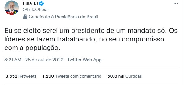 Na manhã desta terça-feira (25), o ex-presidente Luiz Inácio Lula da Silva (PT), candidato a presidente, publicou em seu Twitter que não vai se candidatar a reeleição caso seja eleito no próximo domingo (30). A fala de Lula acontece a 4 dias da eleição em segundo turno em que ele disputa contra o atual presidente Jair Bolsonaro (PL).
