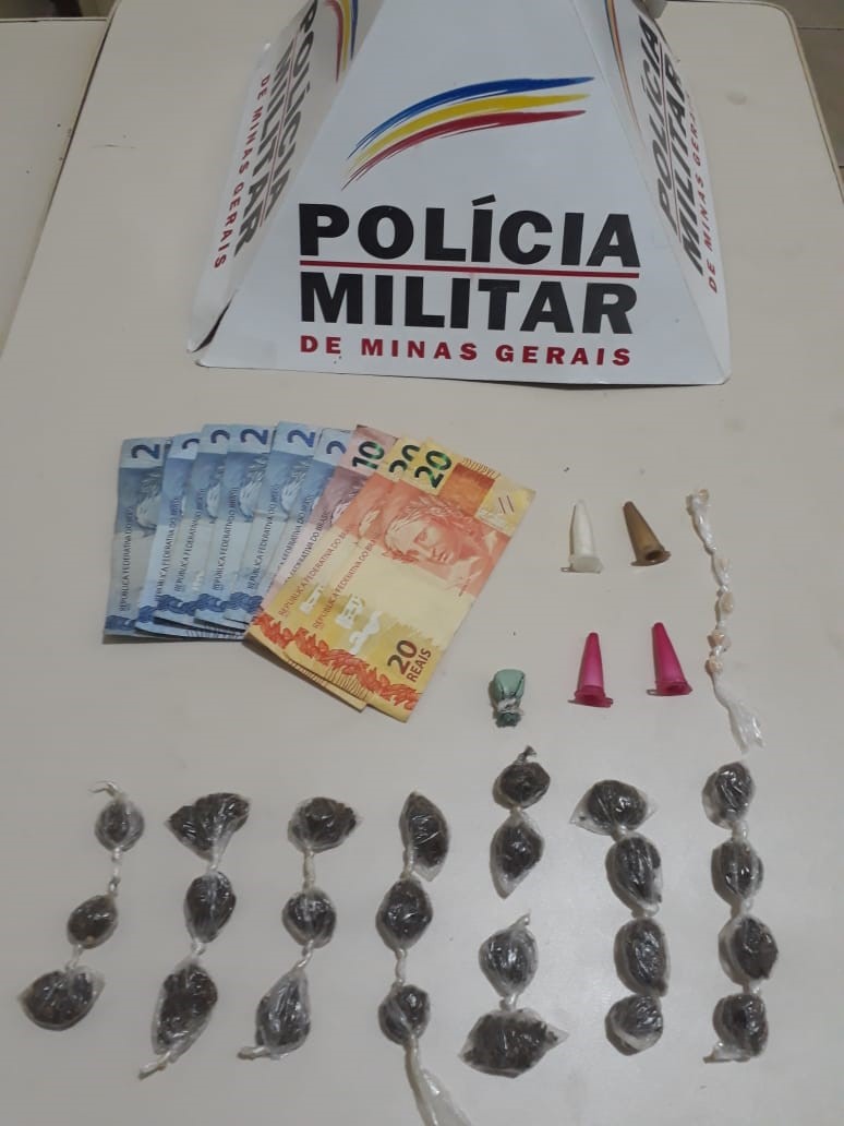 De acordo com os policiais, os militares foram até o local e, durante buscas, acompanhados por testemunha, os militares localizaram dois invólucros plásticos dentro de um engradado, contendo 24 buchas de maconha, seis pedras de crack, quatro pinos de cocaína e R$ 62.