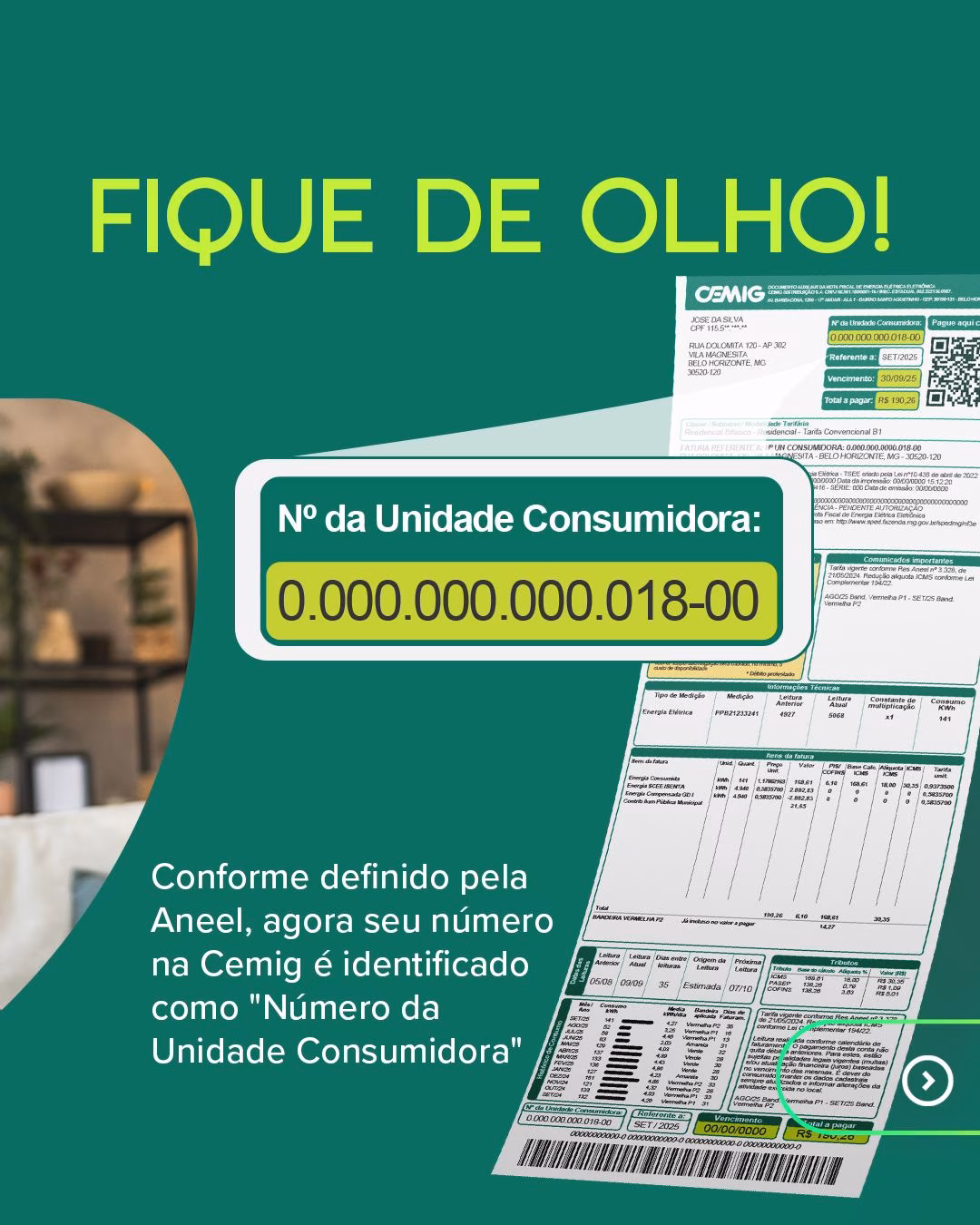 Além do layout, a Cemig substituiu o tradicional número de instalação pelo novo número da Unidade Consumidora, padronizado em todo o país conforme determinação da Aneel.