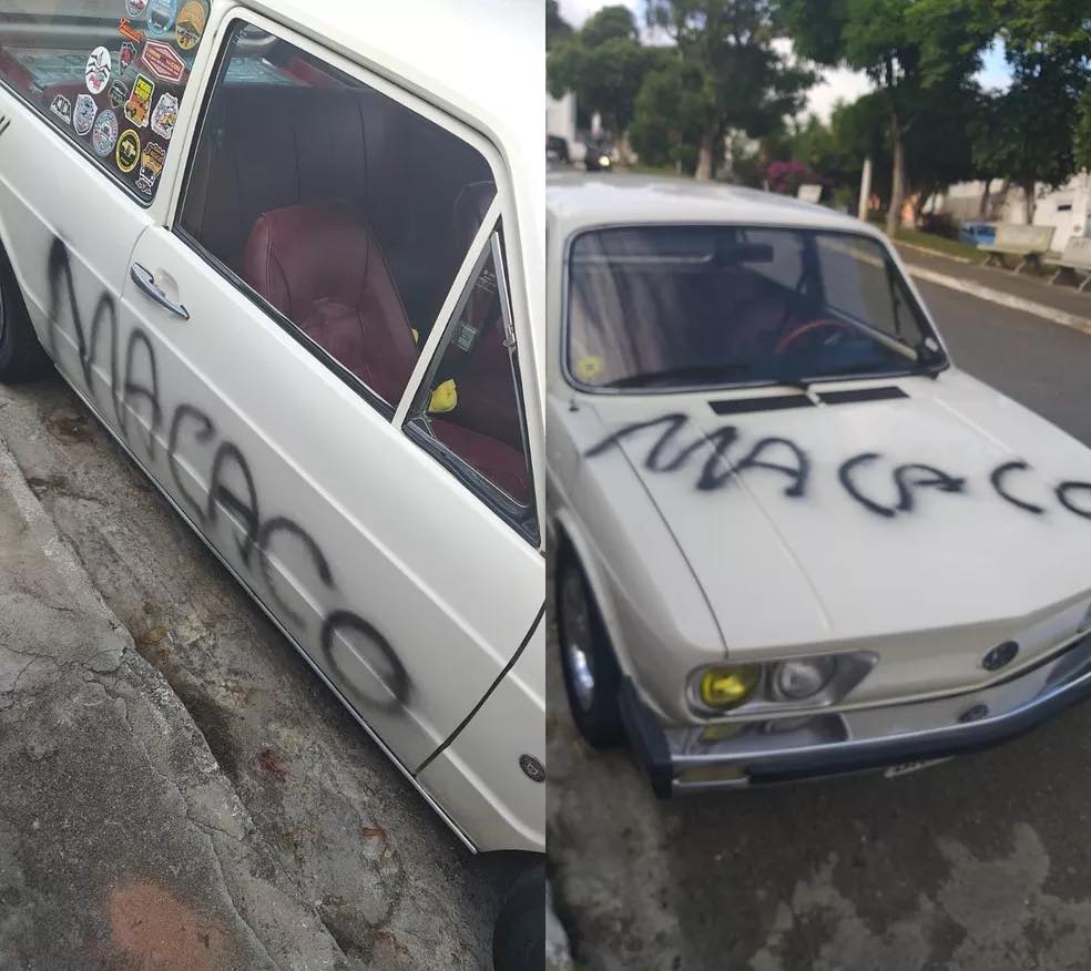 Uma Brasília, ano de 1978, de cor branca foi pichada com a palavra macaco na lateral do carona e no capô. O caso aconteceu enquanto o veículo estava estacionado na frente da casa da vítima.