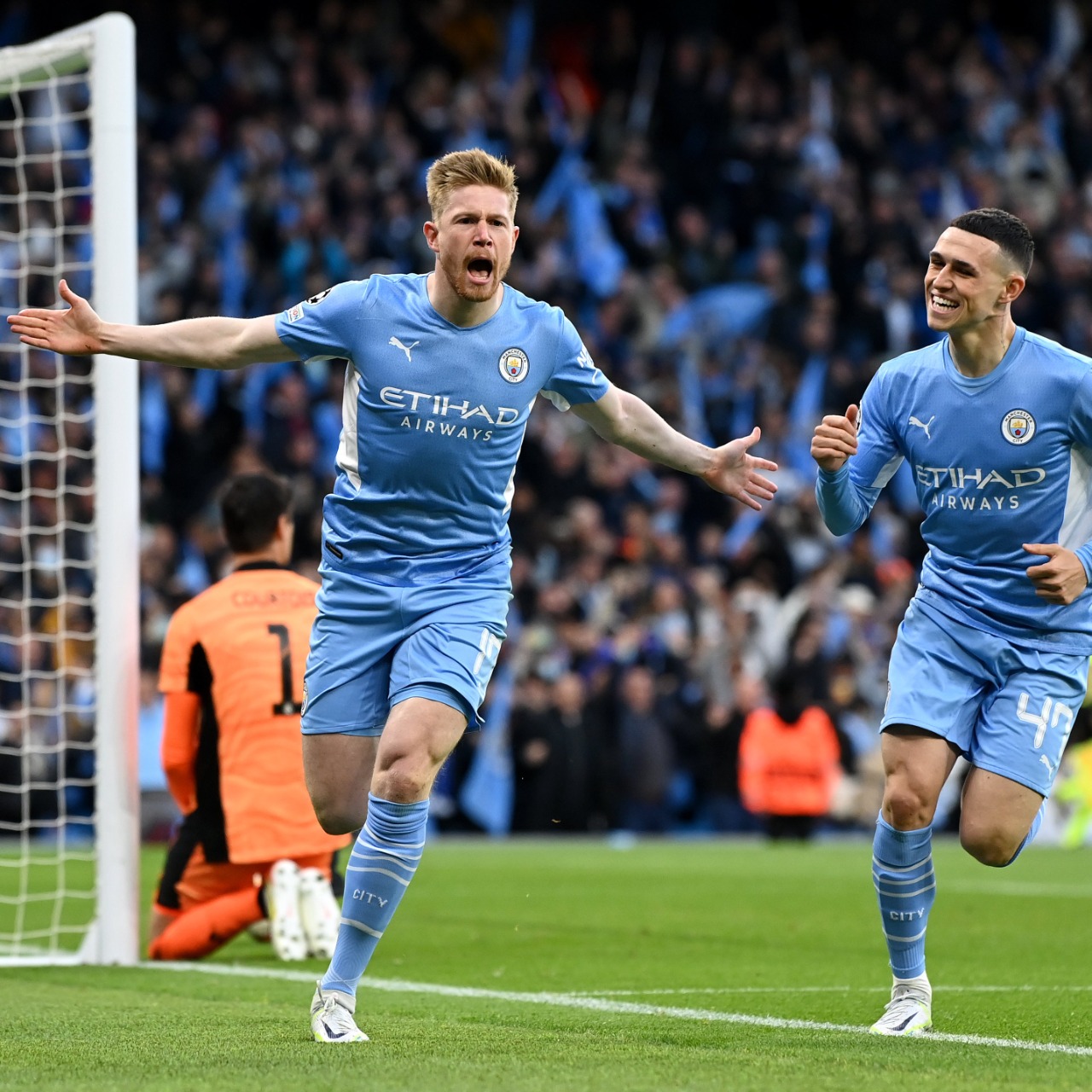 Pelo primeiro jogo das semifinais da Champions League, o Manchester City venceu o Real Madrid por 4 a 3 no Etihad Stadium, nesta terça-feira (26). De Bruyne, Jesus, Foden e Bernardo Silva marcaram para o time mandante. Vinícius Júnior e Benzema, duas vezes, descontaram para o time espanhol. O jogo da volta será na próxima quarta.