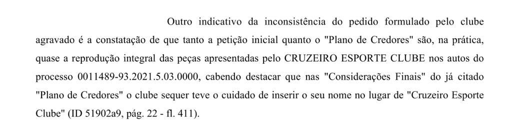 “Outro indiciativo de inconsistência do pedido formulado pelo clube agravado é a constatação que tanto a petição inicial quanto o ‘Plano de Credores’ são, na prática, quase a reprodução integral das peças apresentadas pelo CRUZEIRO ESPORTE CLUBE nos autos do processo 0011489-93.2021.5..03.0000, cabendo destacar que nas ‘Considerações Finais’ do já citado ‘Plano de credores’, o clube sequer teve o cuidado de inserir o seu nome no lugar de ‘Cruzeiro Esporte Clube’ (ID 51909a9. pág 22 - fl. 411).”, diz o documento.