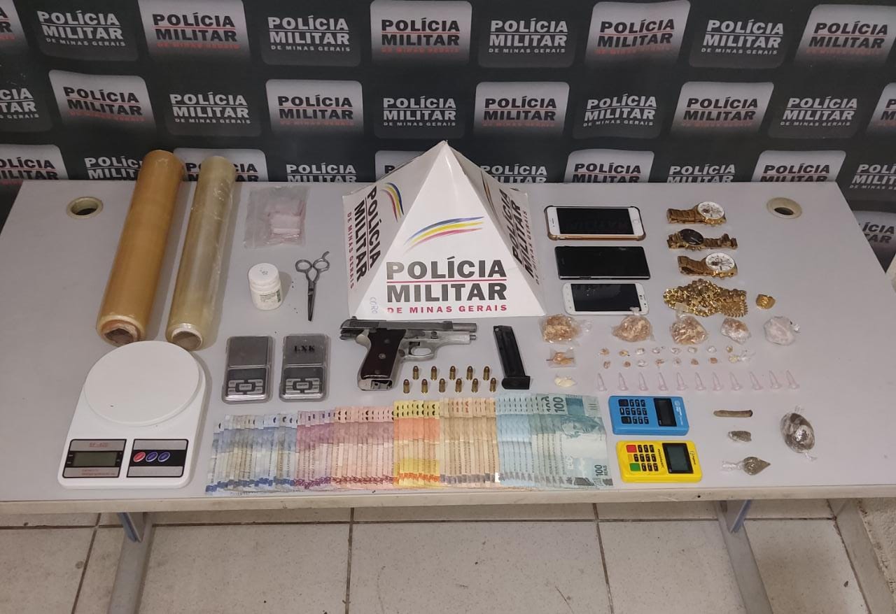 Na manhã desta segunda-feira (26) a Polícia Militar apreendeu arma de fogo, drogas e diversos materiais relacionados ao tráfico de drogas no bairro Santa Helena em Governador Valadares, Minas Gerais.