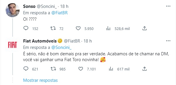 O internauta ficou incrédulo com a resposta, mas a Fiat logo deixou claro que tinha chamado ele no direct. “Eu tô sem reação nenhuma gente! Eles realmente me chamaram na DM. Entraram em contato real”, revelou o sortudo.