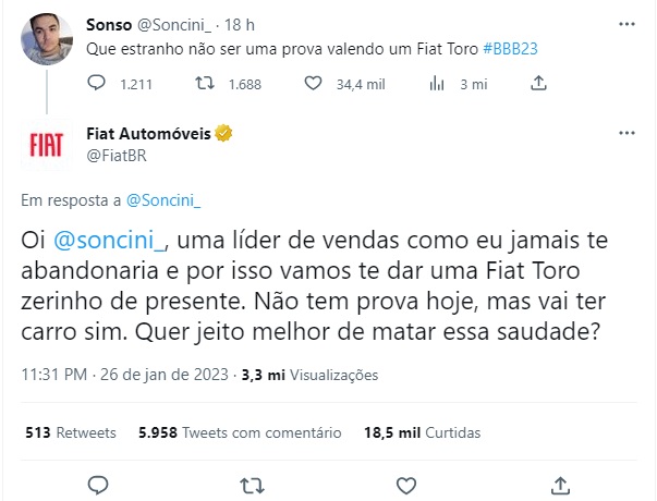 Um jovem, de 25 anos, ganhou uma Fiat Toro da montadora italiana após comentar no Twitter, na noite dessa quinta-feira (26), sobre a prova do líder do Big Brother Brasil 23. O internauta questionou a falta do patrocínio da Fiat no programa, que agora tem a marca da concorrente, a Chevrolet. Atenta nas redes sociais, a Fiat respondeu o usuário “Sonso” dizendo que daria uma picape a ele. Os modelos são avaliados a partir de R$ 144 mil.