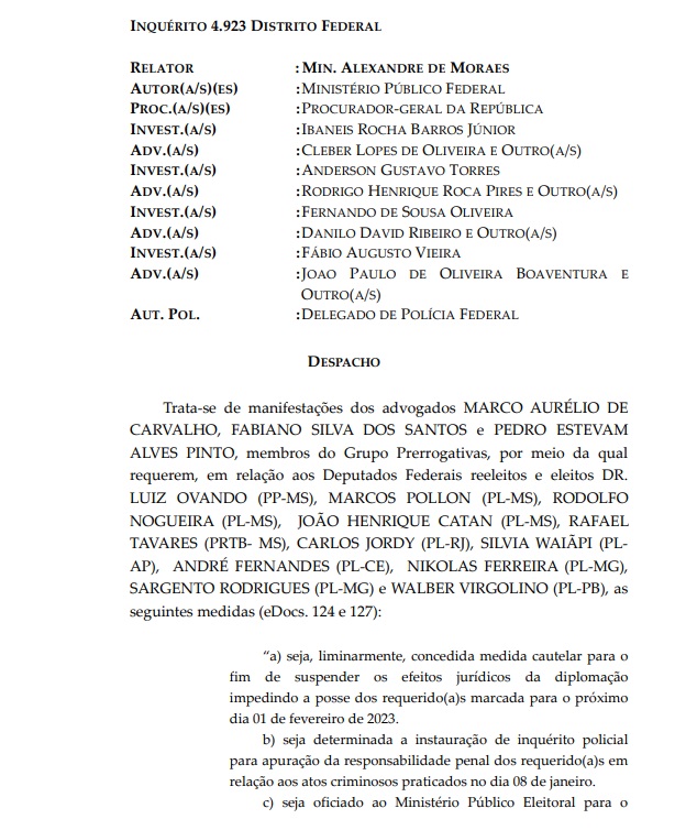 No pedido, os advogados solicita a suspensão dos efeitos da diplomação dos parlamentares, para impedir a posse e a instauração de inquérito policial contra o grupo, "para apuração da responsabilidade penal" dos deputados "em relação aos atos criminosos praticados no dia 8 de janeiro".