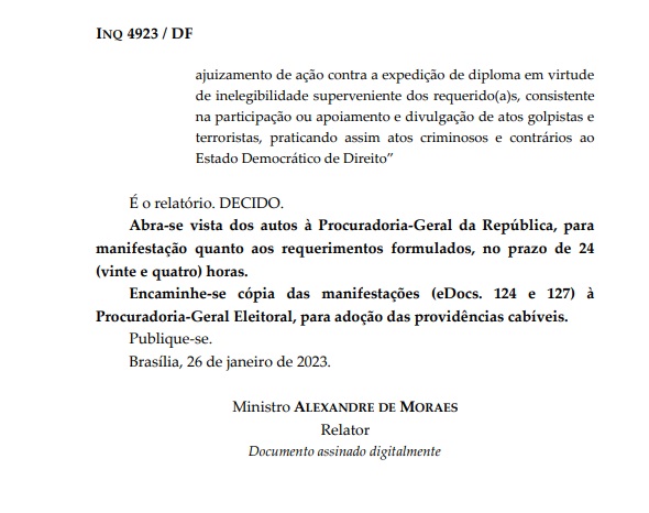 Nesta sexta-feira (27) o ministro Alexandre de Moraes, do Supremo Tribunal Federal (STF), solicitou uma análise da Procuradoria-Geral da República (PGR) sobre um pedido de alguns advogados para suspender a posse de deputados que teriam participado ao ataque aos Três Poderes no dia 8 de janeiro, em Brasília-DF.