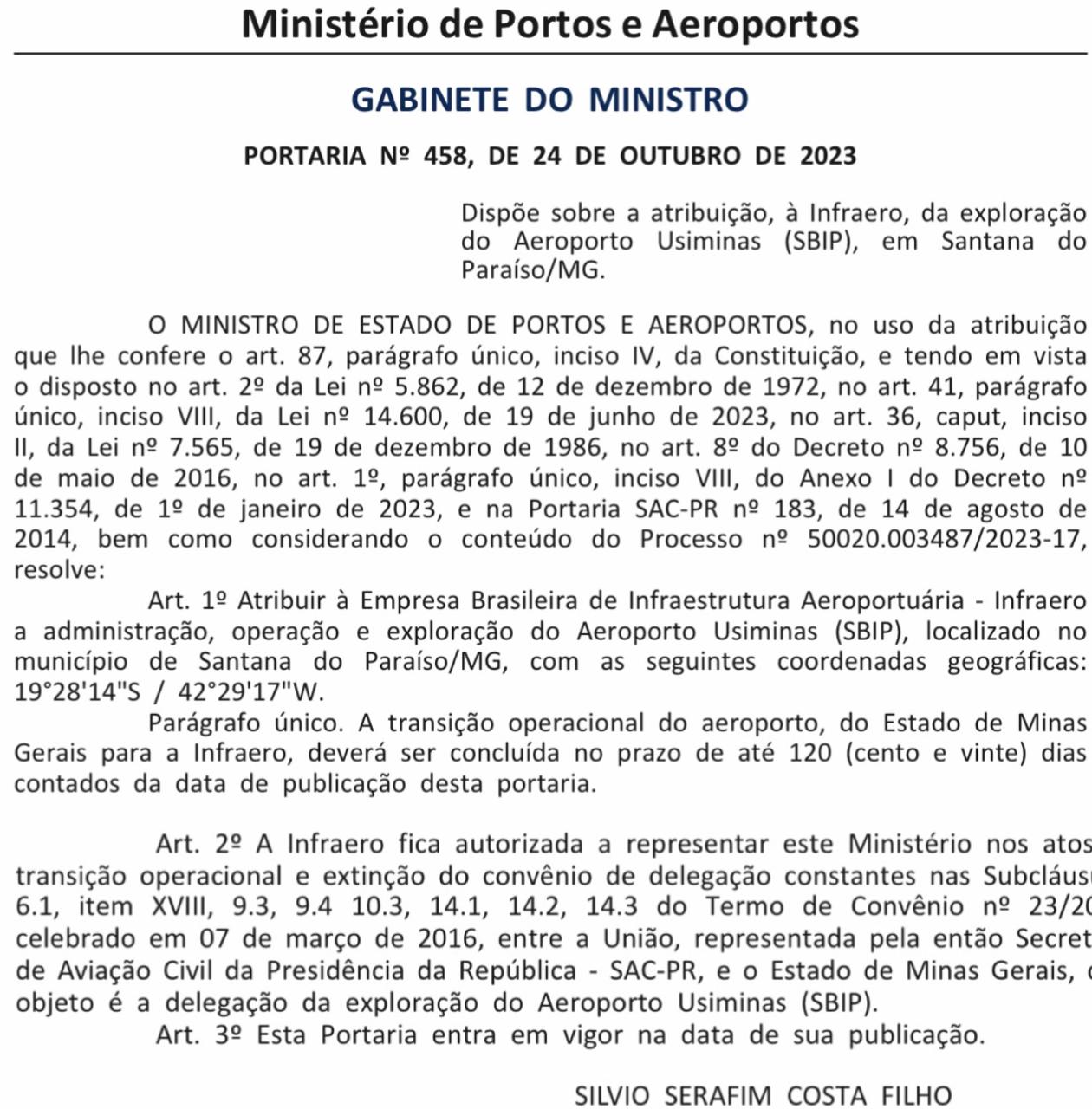 Esta medida está fundamentada em uma série de legislações e decretos. A portaria oficial entrou em vigor imediatamente após sua publicação, dando início ao processo de transição e assegurando que as operações no Aeroporto Usiminas continuem a ser realizadas com eficiência e segurança para todos os passageiros e funcionários.