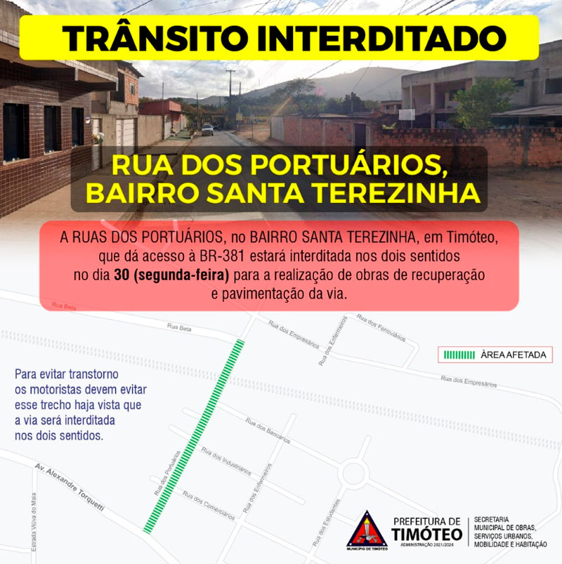 Na próxima segunda-feira (30), será interditado o trânsito na Rua dos Portuários, no bairro Santa Terezinha, em Timóteo, Minas Gerais, para recuperação da pavimentação. A via dá acesso à BR-381.