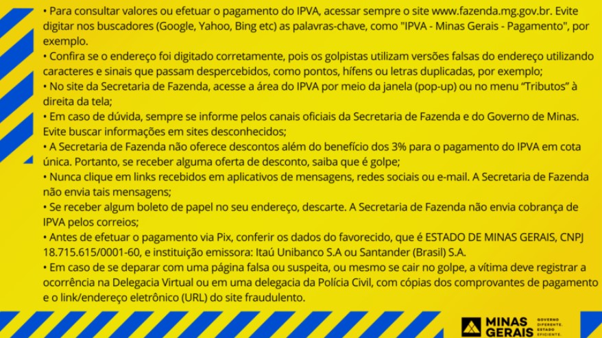 As autoridades reforçam a importância de cautela ao acessar links e sites relacionados ao pagamento do IPVA. Scavazza orienta que os contribuintes utilizem apenas os canais oficiais, como o site www.fazenda.mg.gov.br, para realizar o pagamento.