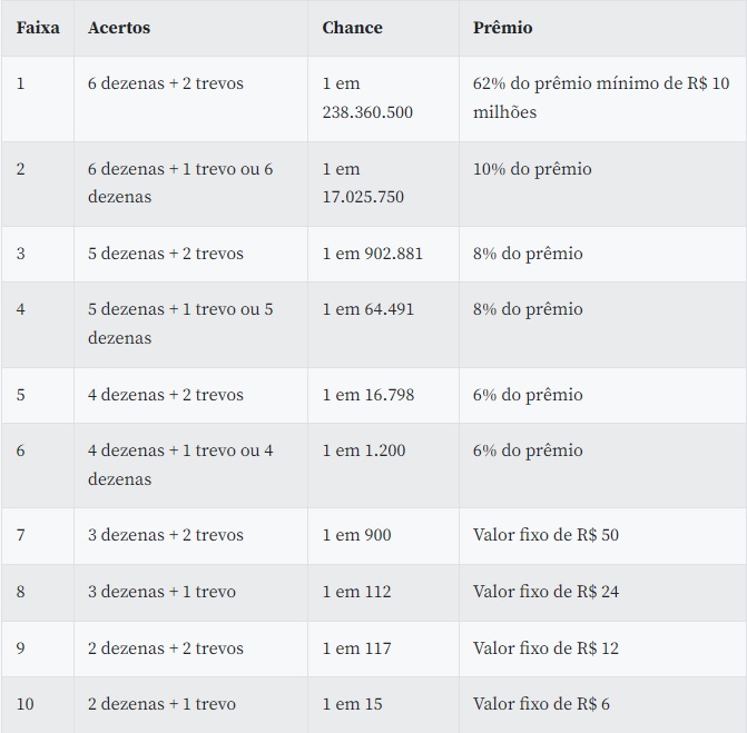 Segundo a Caixa, as chances de acerto das seis dezenas e dos dois trevos é pequena: uma em 238.360.500. As chances de acerto para as faixas de premiação inferiores, entretanto, são maiores. A chance de ter o valor da aposta devolvido (R$ 6) é de uma em 15, sendo necessário acertar dois números do jogo principal e apenas um trevo.
