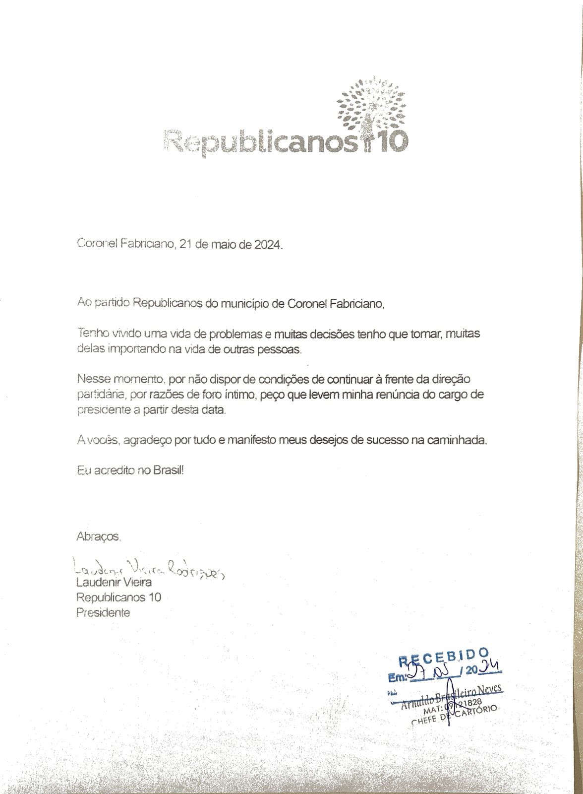 "Tenho vivido uma vida de problemas e muitas decisões tenho que tomar, muitas delas importando na vida de outras pessoas. Nesse momento, por não dispor de condições de continuar à frente da direção partidária, por razões de foro íntimo, peço que levem minha renúncia do cargo de presidente a partir desta data. A vocês, agradeço por tudo e manifesto meus desejos de sucesso na caminhada. Eu acredito no Brasil! Abraços. Laudenir Vieira," escreveu Laudenir em sua nota de renúncia, a qual o Plox teve acesso. Veja na íntegra: