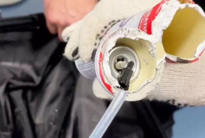 Na mala, parte da carga ilícita estava armazenada em um fundo falso de recipientes aerossóis (veja foto). Já o restante do material foi localizado diluído em embalagens de perfume.