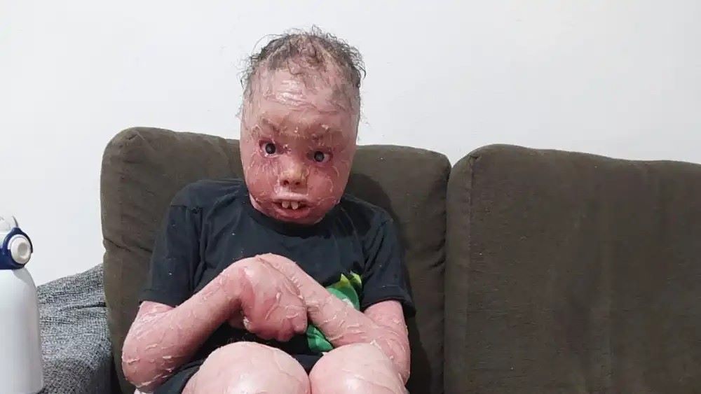 Nicolas Rocha, de 12 anos, convive com Ictiose Lamelar Grave e precisa de 20 tubos de hidratante por mês; tratamento tem custo elevado