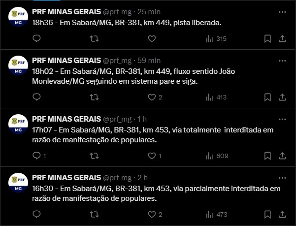 Por volta das 17h, a PRF informou que o bloqueio era total, causando lentidão na região. Mais tarde, às 18h, a corporação atualizou a situação, indicando que o trânsito no local passou a operar no sistema "pare e siga" no sentido João Monlevade, aliviando parcialmente o fluxo de veículos.