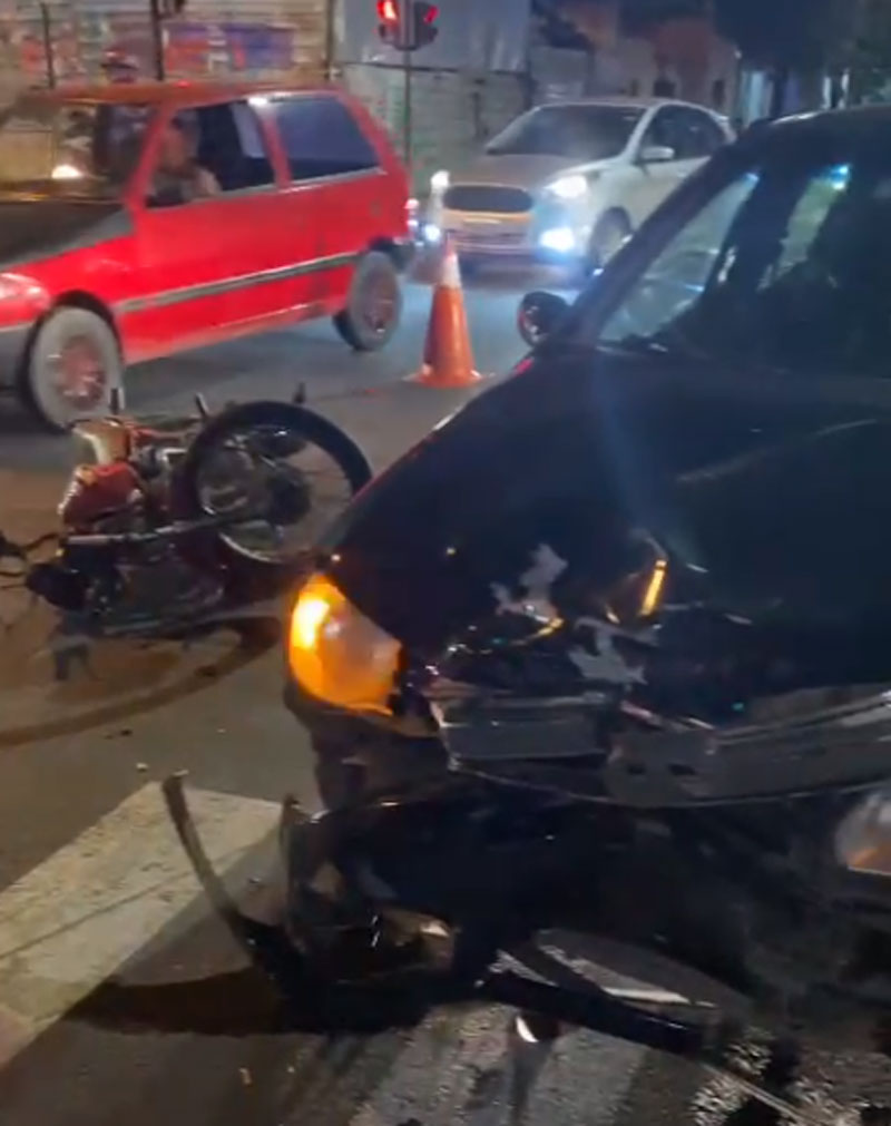 Na noite dessa sexta-feira (30), um acidente envolvendo um carro e uma motocicleta foi registrado no cruzamento da avenida Brasil com rua Jaspe, no bairro Iguaçu, em Ipatinga-MG.