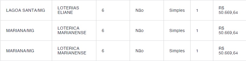 Três apostas feitas em Minas Gerais acertaram os números da Quina e ganharam R$ 50.669,64. As apostas foram feitas na cidades de Lagoa Santa e duas em Mariana.