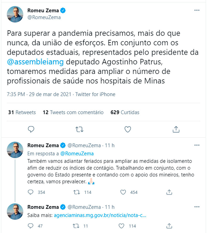 A informação foi divulgada por Zema no Twitter. “Também vamos adiantar feriados para ampliar as medidas de isolamento afim de reduzir os índices de contágio. Trabalhando em conjunto, com o governo do Estado presente e contando com o apoio dos mineiros, tenho certeza, vamos prevalecer”.