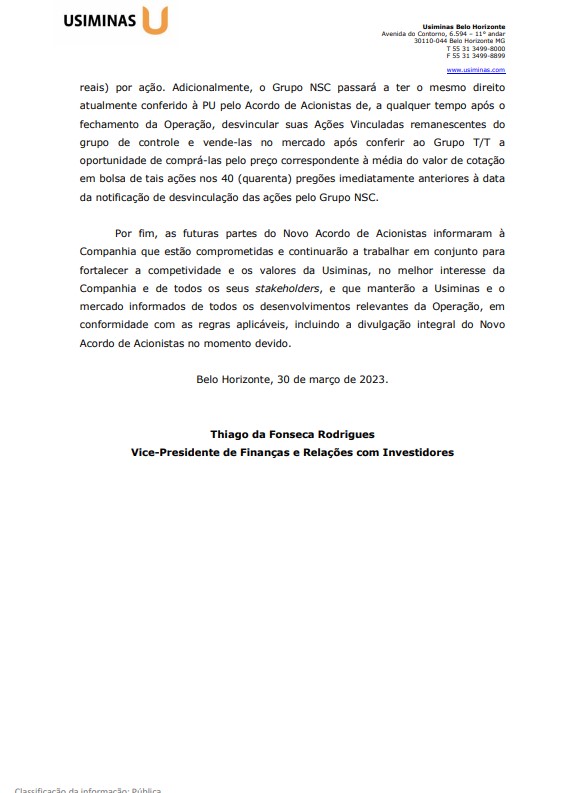 Após a conclusão do acordo, a Nippon Steel poderá vender suas ações remanescentes no grupo de controle da Usiminas no mercado, e a Ternium terá a opção de comprá-las pelo preço por ação dos 40 dias úteis imediatamente anteriores à data do aviso de saída do grupo japonês.