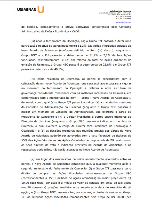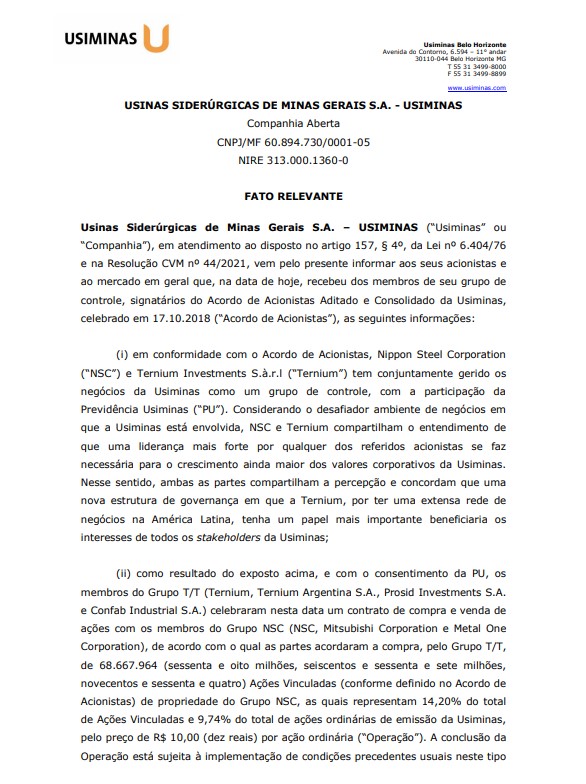 A Usiminas afirmou em comunicado ao mercado que "NSC (Nippon Steel) e Ternium compartilham o entendimento de que uma liderança mais forte por qualquer dos referidos acionistas se faz necessária para o crescimento ainda maior dos valores corporativos da Usiminas". A companhia acrescentou que "ambas as partes compartilham a percepção e concordam que uma nova estrutura de governança em que a Ternium, por ter uma extensa rede de negócios na América Latina, tenha um papel mais importante, beneficiando os interesses de todos na Usiminas".