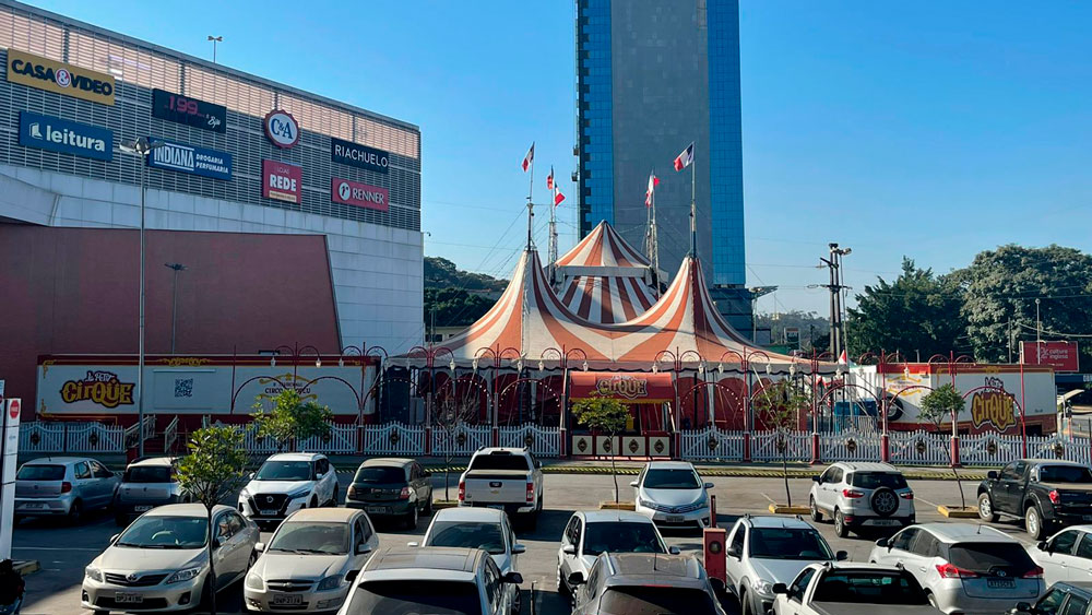 O circo no estilo europeu já está montado no estacionamento do centro de compras