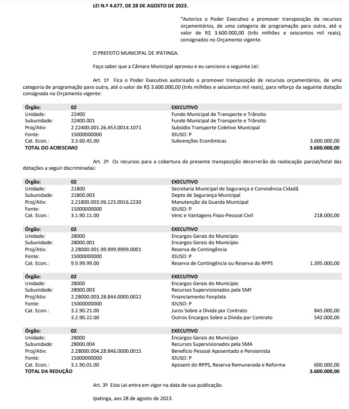 Conforme o documento publicado no Diário Oficial do município (Veja na íntegra abaixo), “ a cobertura da presente transposição decorrerão da realocação parcial/total” da manutenção da Guarda Municipal, reserva de contingência, financiamento Fonplata e Aposento do RPPS, Reserva Remunerada e Reforma.
