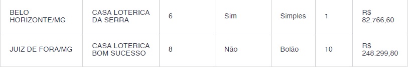 A primeira teve 8 números apostados e foi feita na Casa Lotérica Bom Sucesso, na região central da cidade. Já o sortudo da capital apostou seis números na Loteria da Serra, no bairro da Região Centro-Sul de Belo Horizonte.